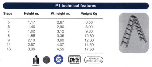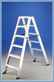 Welded professional stepladder in ribbed aluminium for fitters and decorators. It is equipped with non-skid steps (8 cm large) on both sides, anti-opening straps and hinges.
