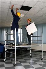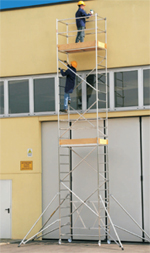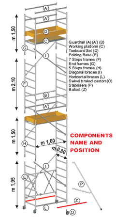 Is an aluminium foldable tower expressly studied for professional use. It is composed by a base module measuring 1.70 m. in height, an ending span measuring 1.84 m. and 2 intermediate spans of 1.5 and 1.8 meters for a total height of 6.76 m. It is suitable for maintenance and walls whitening works up to 8,76 m. It is made of lightweight aluminium tubular alloy (ø 50 mm) with non skid knurled rungs. Base module is pre-assembled (made by very few and light components) and can be opened very quickly to obtain working position. Overall dimensions are very reduced and that makes the scaffold also very easy to be transported and to be assembled in few minutes and without using tools. Rust cannot corrode this material which is long lasting. BASE DIMENSIONS